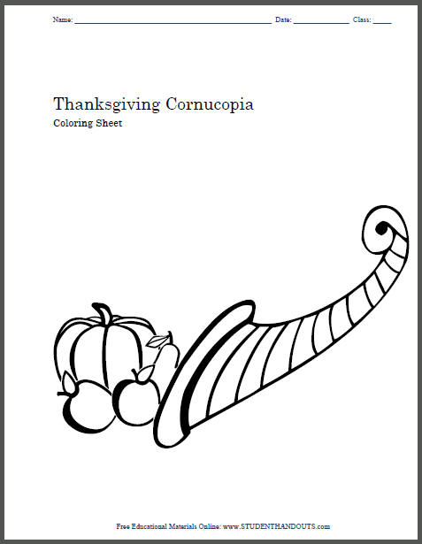 Cornucopia. These free, printable cornucopia coloring pages are fun for kids during the Thanksgiving season. Along with the cornucopia coloring pages, there are fun, free sheets of Pilgrims, turkey sheets and many more printable Thanksgiving coloring pages. Thanksgiving Day is a time for family get-togethers, and of course, fun, free Thanksgiving coloring pages!